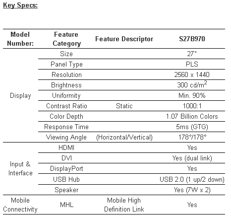 The Series 9 monitor features Samsung's Plane Line Switching (PLS) panel technology. This offers accurate color reproduction achieving 100 percent of the sRGB color spectrum, reproducing over one billion colors that can been viewed at wide horizontal and vertical angles. Featuring a quad high-definition (QHD) resolution (2560 x 1440), the Series 9 monitor now provides professional capabilities to the consumer, regardless of the user's application.