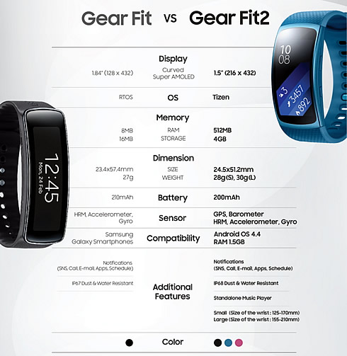 Display 1.5?, Curved Super AMOLED 216 x 432 Chipset Dual Core (1 GHz) Memory 512 MB (RAM) / 4 GB Storage Connectivity Bluetooth v 4.2 Sensor Accelerometer, Gyro, HRM, Built-in GPS, Barometer Dimension 24.5 (W) x 51.2 (D) mm Weight Small: 28g