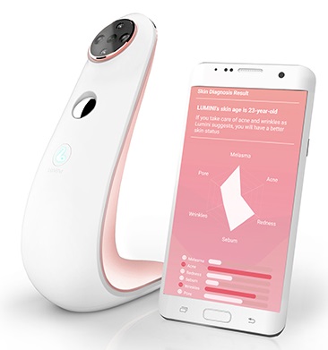 Lumini is a portable device that spots skin problems before they happen. After taking a picture of the face with Lumini, the device analyses the information with its own algorithm and sends the information to a smartphone app. The device identifies issues under the surface of the skin, like pimples, freckles, increased pores, wrinkles, redness, and sebum. Lumini also recommends cosmetic products based on the analysis and provides a remote consulting service with a dermatologist or a skincare specialist.