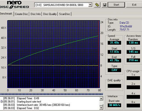 For this test (and for all ensuing tests with CD-R media), the CD-R disc was burned to its maximum capacity and at its maximum speed. Then, the same disc is read with the Disc Speed software, and the disc was scanned for digital errors (C1 and C2).