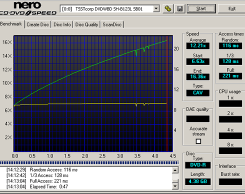 The drive had problems reading the disc and slowed down right after the 4.0 GB mark as you can see above.