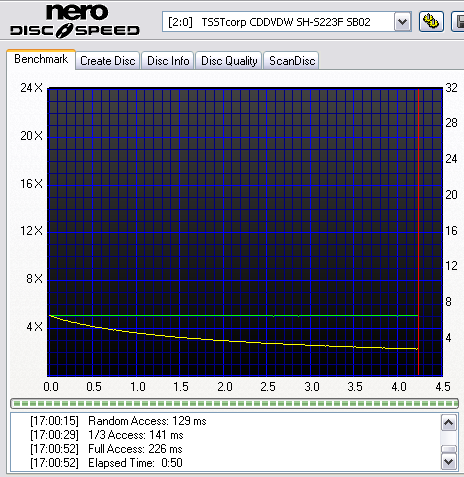 In this page we check the reading abilities of the SH-S223F burner with all the supported CD and DVD formats. For our CD and DVD transfer rate tests, we used the Nero Disc Speed utility.