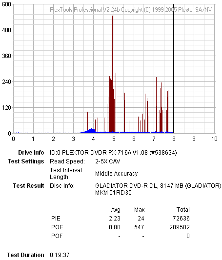 With Verbatim DVD+R DL media, we got very good quality graphs in both cases (CD-Speed & Plextools graphs) at 6X effective burning speed. In the case of Verbatim DVD-R DL media, we got similar performance with the +R DL media. Overall good quality DL burns.