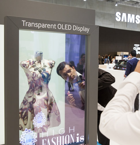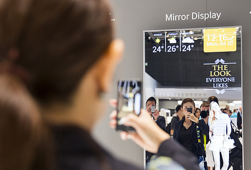 Once a customer selects items to try on, Samsung’s Wi-Fi enabled, 55-inch Mirror Display greets consumers in the fitting room. Utilizing transparent and reflective OLED panels, the display could include information about the store’s products as well as discount information.