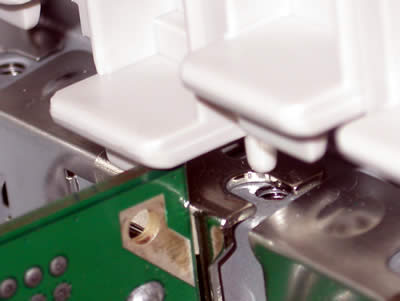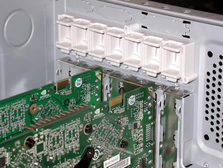 Moving on to the graphics cards, the installation is quite easy, though some un-screwing must take place. As shown in the previous page, the plastic lock above the expansion slots must be removed with the three screws which reside on the exterior of the case, and then the expansion slots will become free. We then install the PCI devices (and AGP) and we put the lock back in place...