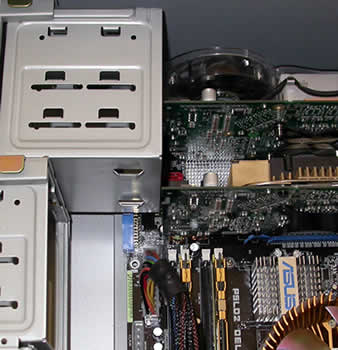 As mentioned above, SLI card owners will find themselves in a bit of trouble if they try to unhook any HDD drives, or install them after installing the graphics cards. This is due to the HDD cage sliding out towards the motherboard rather than upwards, as seen in the screenshot below...