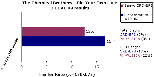 The Sanyo CRD-BP3 drive, as the previous model, has a DAE ripping speed limited to 13x max. For some people this might sound good, but we think the same as most people would: "We want more!" Let's hope that Sanyo will listen to us when building its next model ;) As the test shows there isn't any direct comparison to the two drives. The PX-W1210A keeps it's thrown as a DAE king and delivers 16.9x average DAE speed when the BP3 model is limited at 12.6x. All produced WAVs were free of clicks and pops so the drive will not let you down in DAE quality.