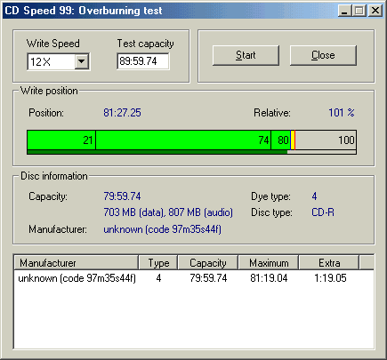 We prepared 2 data jobs (75:01:38 and 80:54:18) and we burned them. Sanyo CRD-BP3 finished both jobs with success. We also tested if the BP3 had any problem reading the oveburn CDs with CD Check utility. No problems here.We also tested Sanyo CRD-BP3 with 99min CDs..Using CD Speed 0.7 overburning test we saw that the drive can only overburn up to 81:19min using them. So forget using Sanyo CRD-BP3 with 99min CDs..
