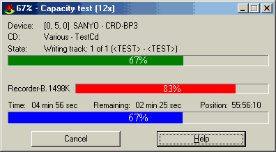 Next we installed Nero v5.0.1.8 in order to test the Overburn capabilities of Sanyo BP3. For that propose we used Feurio 1.51 in order to determine how much Overburn space we could have from Ricoh 74 & 80min media. The tests results showed that we could Overburn with up to 75:31:51 and 81:09:23.