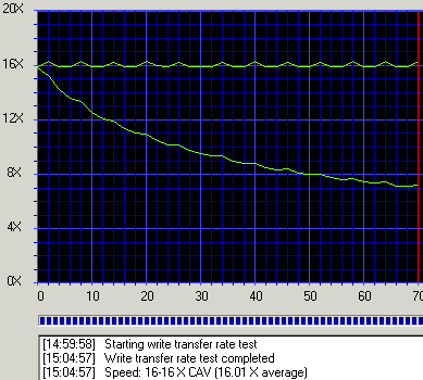 The Sanyo drives gave the lower burning time in this test. The competition wants 4 (CRW2100E) and 6 extra seconds ( PX-W1210S) to finish the task. Let's head over to the most interesting part..The 16x write speed!