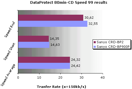 We created a DataCD with Nero 5.0 using the Sanyo CRD-BP2 CDR-W drive. Several copies were created on different media types at 12x speed. This test was performed in order to test the compatibility with various CD media, that have been written at 12x, how the Sanyo CRD-BP900P drive performs. CD Speed 99 v0.66 was used to measure the performance of the drive with the different media.