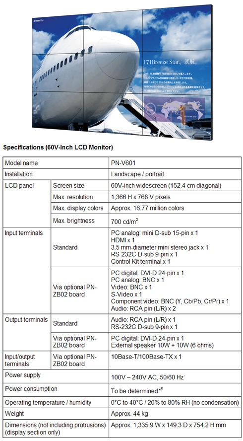 Other features include a zoom function, the ability to combine the optional PN-ZR01 Control Kit with multiple PN-V601 LCD monitors in order to control all displays using a single remote control unit; a brightness sensor that adjusts the brighness of the system in order to match the lighting at the installation location; and an optional Interface Expansion Board (PN-ZB02) for additional inputs, including DVI-D, component video, and LAN.
