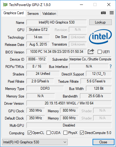 The Intel i3-6100 CPU we have installed is featuring the Intel®HD Graphics 530 engine. The graphics base frequency is 350 MHz, and its max.