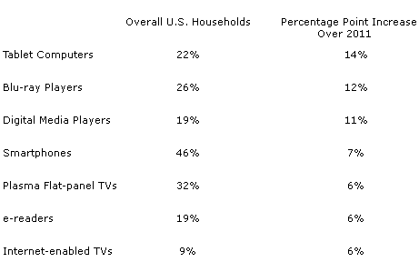 Tablet computers were also a leading growth category over the past 12 months, CEA said. U.S. household penetration levels for tablets increased 14 percentage points from last year and represents the largest increase in the industry. Blu-ray players and digital media players also saw double digit growth in household penetration numbers.