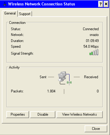 However, the next day, for an unknown reason, the wireless network didn't seem to perform as expected. Under WinXP SP2, the player had acquired a network address (either automatically or manually), however no packets could be received, as Windows XP network properties showed.