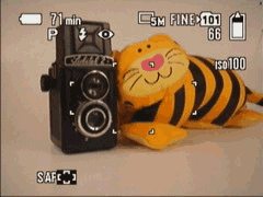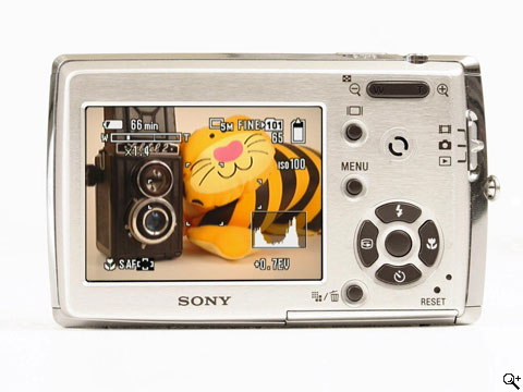 Pressing the "Display" button in record mode changes the way the exposure and battery/memory info displays on the screen. It can also turn off the backlighting to preserve energy and prolong battery life. The exposure histogram is a much appreciated feature. |