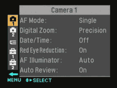 Choosing the "SETUP" option brings up these menu screens with settings concerning the camera's operation, menu display language, time and power saving options, file naming, etc. You can also setup the camera's communications protocols. |
