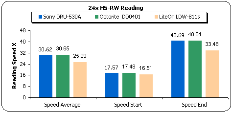 Again, the Sony and Optorite drives had similar times with the Sony being slightly slower, and both being faster that the LiteOn, especially in the full seek where the LiteOn needed 200ms for the Full seek.