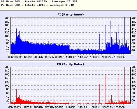 The results are not any good since the PI/PO error rate is really high. The test was performed twice with the same results. The DVD-R disc was unreadable.