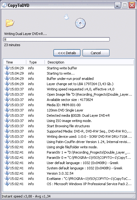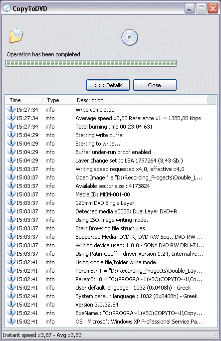 The burner needed 23:04mins to complete this process. The average speed was 3.83X as reported by the CopyToDVD software.