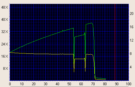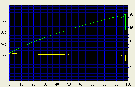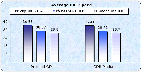 The Sony DRU-710A supports up to 48X CAV DAE speed. When using a pressed AudioCD and its CD-R copy with EAC, we measured the following results: