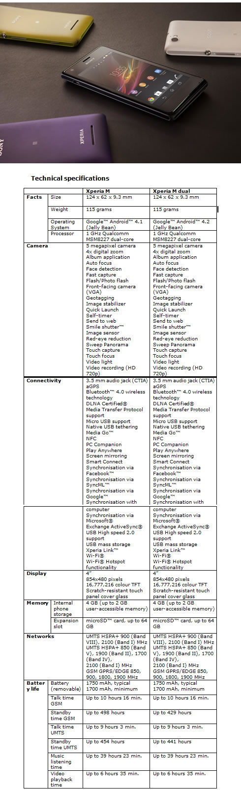 Xperia M and Xperia Mdual will be available in Black, White and Purple from Q3 2013 ? a Yellow colour variation will also be available for the single SIM model.