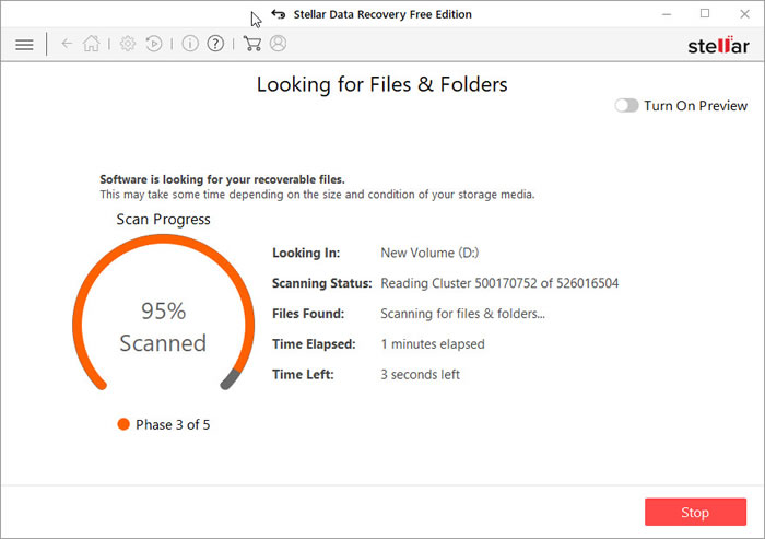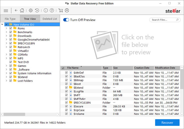 In our case the D: volume is an NVME drive so the process is rather fast. Users will be presented for all results with a either File Type/Tree View or Deleted List. You can view all files with the Preview for a quick look.