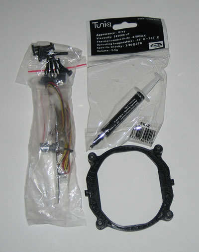 The retail package includes the CPU cooler, mounting clips for socket LGA 775/AM2, a fan controller, a Tuniq TX2 thermal paste and several mounting clips for the base. We can say that the retail package is complete..