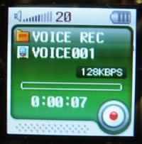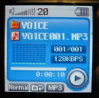 The MP3 Playback screen offers several bits of information, like the filename or ID3 tag, the file bitrate, equalization mode, repeat mode, and volume/battery information. Pressing the ">>" or "<<" buttons, you can move forwards and backwards, but the response is a little sluggish, and with big files can be a headache.