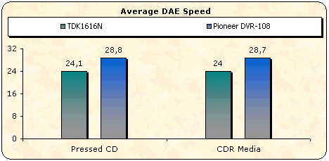 The TDK 1616N supports up to 13-32X CAV DAE speed. The following results were reported when using Exact Audio Copy.
