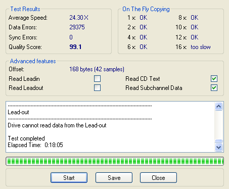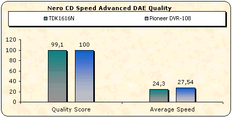 Very good recorders can achieve a perfect quality score of 100. The TDK 1616N achieved a score of 99.1, which is a very good score (but not perfect) while the Pioneer DVR-108's average speed was faster than that of the TDK 1616N. The TDK drive cannot read Leadin data and Leadout data, but it can read CD Text and Subchannel data. The reported average speed was 24.30X. Again, the drive reported similar behaviour with the TDK 882N drive.