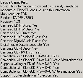 To create an image of the various protected titles onto a hard disk, we used CloneCD v.4.3.2.2 software and the appropriate settings, depending on the protection type of the inserted discs. Below the capabilities of the Nec drive are summarized, according to CloneCD software. As you can see the drive supports writing of CD+G under RAW DAO: