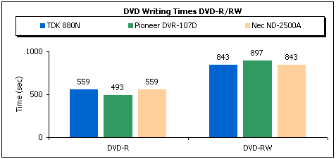 The best recording times are illustrated in the following table. The values were taken after burning 4315MB of data on various DVD±R, DVD±RW media, using the maximum allowed writing speed for each disc. For comparison, we also include the writing times for the Pioneer DVR-107D and Nec ND-2500A.