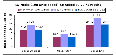 For the RW tests we used Ricoh HS RW media written at 10x speed. The TDK CyClone drive has slight better performance than the PX-W1210A; this however is nowhere as good as what the Sanyo CRD-BP3 delivers: