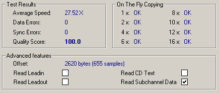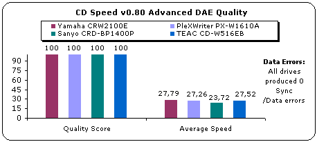 As you can see all drives got a perfect 100 score in the Advanced DAE Quality test. TEAC CD-W516EB gave a good performance (27.52X) almost equal to PlexWriter's and Yamaha's. The Advanced test confirmed that the drive supports reading of SubChannel data but also showed that it does not support CD Text reading however this doesn't apply with other softwares. We tested this option using Feurio's CD Manager v1.61 built-in CD Text Player. The CD we wrote with TEAC CD-W516EB contained CD-Text and read CD-Text without any problem...