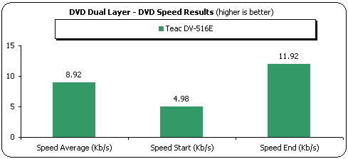 The ripping speed of Teac DV-516E is high and reaches the 8302 kb/sec (6X). However, the Asus E616 is faster with 9110 kb/sec.