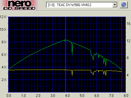 The Dual layer OTP disc was not a problem for the TEAC DV-W58G drive. The average reading speed was 6.18x, while the end speed reached at the end of the first layer was 8.32x. There are some annoying glitches where both the disc's velocity and hence speed, took some tumbles during reading of the second layer. It remains to be seen if this proves a problem during our quality tests later on this review.