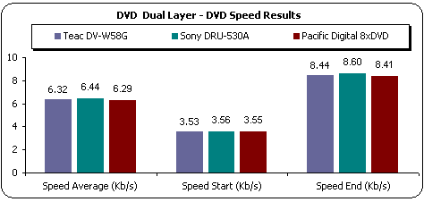 After the end of the Dual Layer PTP DVD-ROM test, we can see that again there is very little between the drives and while the TEAC drive was not the fastest, the speeds are quite satisfactory. The reported end speed for this test is 8.44x, which is slightly slower than 8.60x for the Sony drive which proved overall, to be the fastest drive among the three.