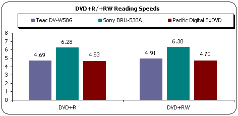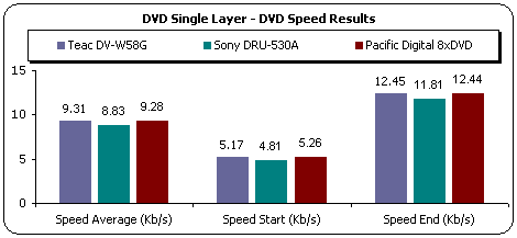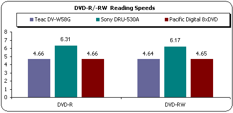 The drive is specified as having a maximum reading speed of 6x with DVD±R/RW media, compared to the SONY DRU-530A's 8x, hence it's times are going to be below those of the SONY drive's, which happened to be the fastest in this test. NeroCDSpeed reports that the average reading speeds with the TEAC drive for all four media is a little above the 4.6x mark, while the reading strategy is CAV with all formats.