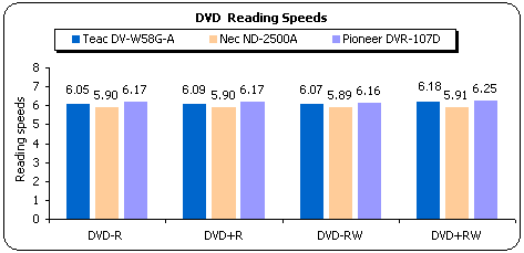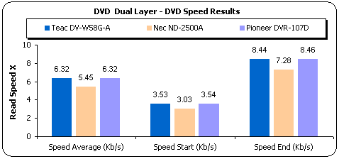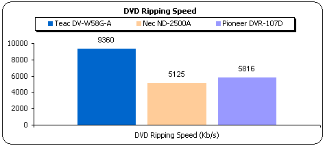 We measured the DVD-Video ripping speed for the TEAC DV-W58G-A using the latest version of DVD Decrypter. The DVD Video title is the "Matrix" pressed DVD-Video.