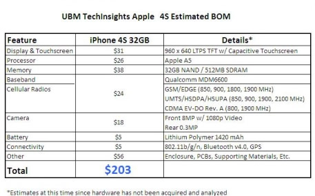 The bill-of-materials (BoM) for the 32-GB version Apple's newly announced iPhone 4S is estimated to be about $203, roughly the same as the original iPhone 4's BoM when it was launched in mid-2010, according to a preliminary estimate by UBM TechInsights.