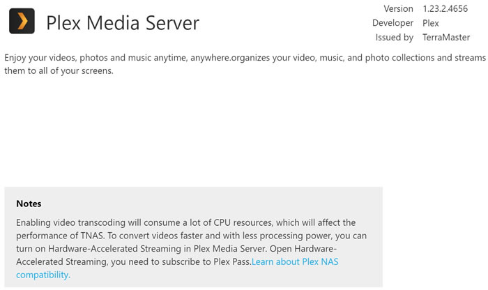 While the Plex application supports hardware transcoding, in order to enable it you need Plex pass to activate it, in Plex App Web interface, Find Control Panel > Hardware > Hardware Resource and Turn on Use hardware acceleration when available. If you don’t enable hardware transcoding you cannot playback x265 neither 4k x264 files.