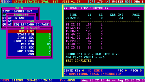 You can set the start/end time and the passes. After it finishes the software will report the total C2 errors. This test will work only with LiteOn CD/DVD-ROM since with the LiteOn recorders produces error message: