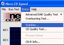 ScanDisc is a function, which shows you the quality of a disc. The test consists of two parts; the File Test that simply reads all files on the disc and reports all errors. This test can also be used for benchmarking to give you an idea on how well the drive performs with for example software installing. The Surface Scan checks the quality of each sector and shows the results in a graph.