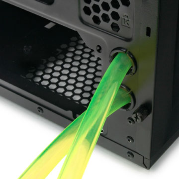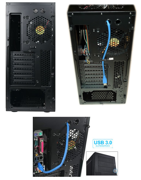 The back of the case two metal loops on the side panel and the case itself that allow a lock to be installed that secures the side panel in place. Another security measure is the keyboard and mouse cable clamp. But probably the first think you'll notice once you take a look to the rear panel is a blue USB cable that hangs down from the water cooling ports at the top. This cable is actually connecting the rear USB 3.0 port of your motherboard with the front USB3.0 connector. This could be considered as an inconvenience, but it may be worth it if you want to use compatible devices on a regular basis. And of course, once a standard for for internal USB 3.0 headers is decided some time next year, the specific cable will not be required running through your case.