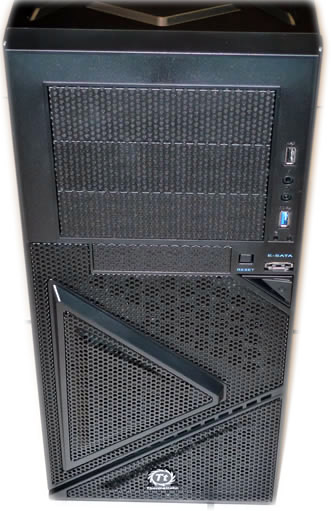The front of the Armor A60 is a plastic bezel that features a triangle shape, three 5.25" device bays, a steel mesh cover, and the front I/O ports. These include one USB2.0, one USB3.0, audio and eSATA, as well as the power and reset buttons.
