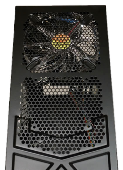 The top of the case features some triangle extrusions as well as a very open amount of perforations that allow for an extra 120mm fan to be installed. A 200mm blue LED fan is included, set up as an exhaust.