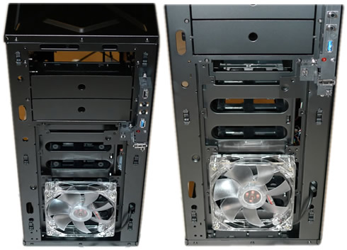 The top-most internal bay has hot swap connectors, since this is the bay that is accessible from outside the case.The external 3.5 hot swappable hard drive bay is protected by a swinging flap that stays closed when there is not a drive in use, but retracts back when a drive is inserted into the hot swap bay in the side panel. All it takes is to push the drive in, wait to hear the click and any hot swap compatible hard drive is ready for action. This is very handy feature. Of course, the bay can also support 2.5" HDD or SSD: