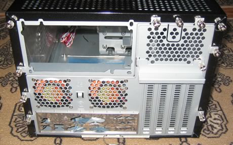 And finally, on the back, we can see the empty space for PSU, the two 60mm rotating fans, another extra spot for another 60mm fan (top right) and four PCI backplane brackets for adding extra cards to your system.