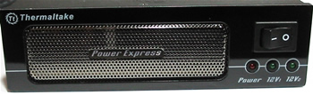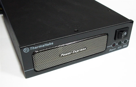The front design is eye catching. Reflective black front panel, equipped with a cooling vent which has the Power Express logo on it. On the right, you will find a power button and underneath, the three LEDs show the operating status.